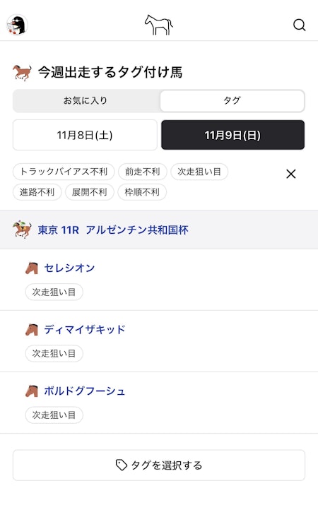 この機能によりお気に入り馬だけではなく、特定のタグがついた今週の出走馬を一覧表示させることができるようになりました。
